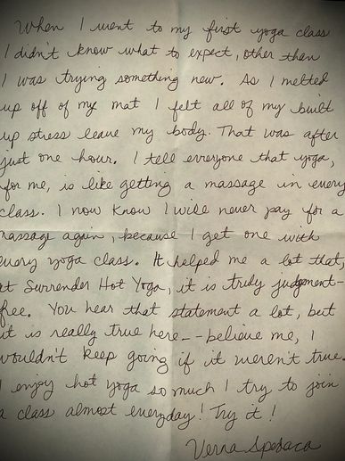 With age and probably not eating that clean I started to gain weight. I figured since I worked out, I could eat whatever I want. Not true! Sure my muscles were toned & I had stamina but I couldn’t lose weight. One day my daughter asked me to join her in a hot yoga class back in 2017. I told her it sounded boring and I hate the heat. I tried it anyway and got hooked. Been doing yoga since 2017 and I was very happy when Surrender Hot Yoga studio opened in Los Lunas. Ever since I’ve been doing yoga I have lost 30 pounds. I feel that it helped with my weight loss, as well as with my patience and back pain.